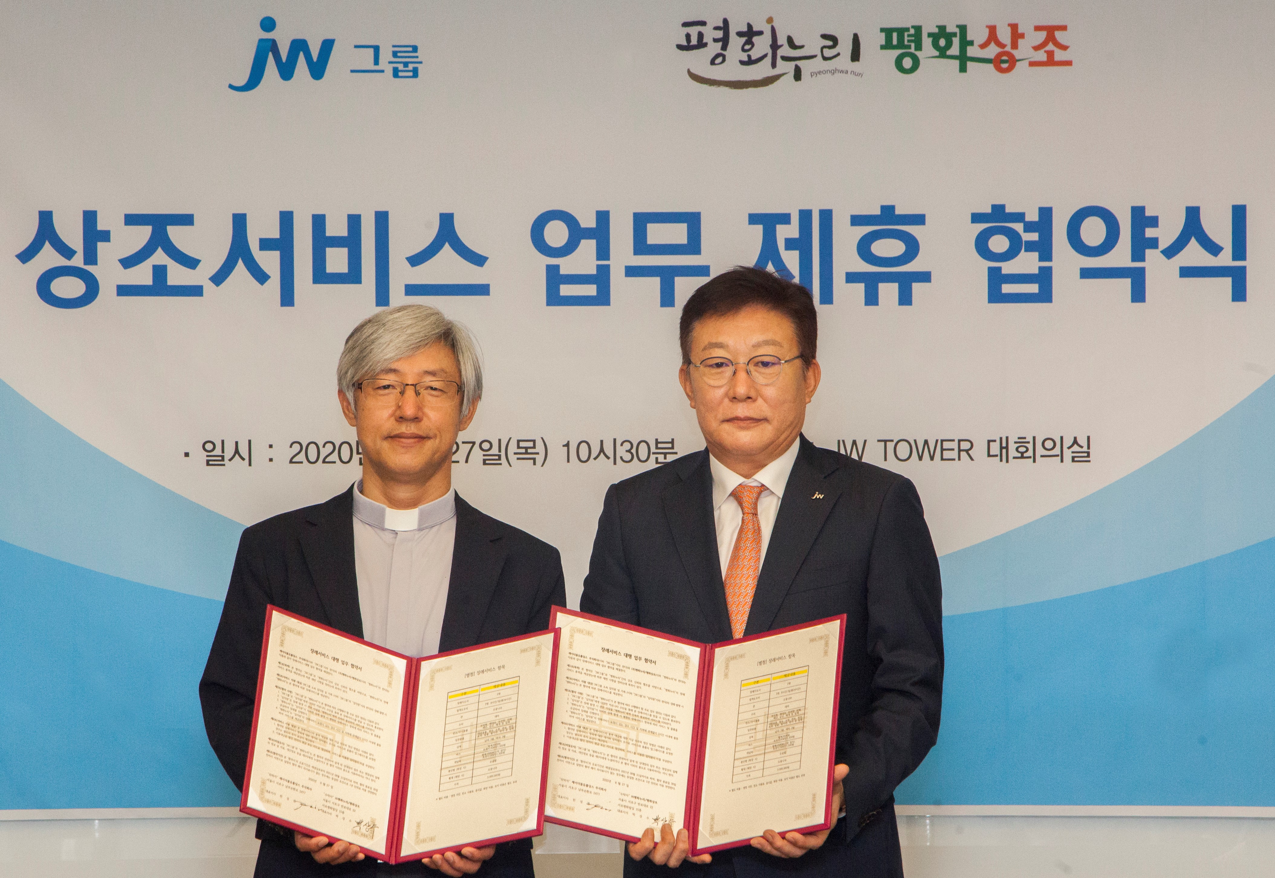 ㈜평화누리/평화상조(이하 평화상조)는 서울특별시 서초구 남부순환로 JW홀딩스 본사 14층 회의실에서 「임·직원 및 가족 장례서비스대행」을 위한 업무협약식을 지난 8월 27일 체결했다. JW홀딩스는 글로벌 헬스케어 그룹을 지향하는 지주회사로 JW중외제약, JW신약. JW생명과학, JW메디컬 등 2,000여명의 임직원들로 구성되어 있다. 평화상조는 이번 협약을 통해 이들 회사의 임직원 및 가족의 장례를 보다 편리하고 경제적인 가격으로 장례서비스를 제공할 수 있게 되었다. 평화상조가 제공하게 될 서비스는 장례지도사와 입관도우미 및 접객도우미 파견, 관·수의·봉안함과 상복·제단 꽃 장식 등 60여종의 장례용품, 장의버스와 리무진 등이다. 고객이 성모병원 직할장례식장(7곳)을 이용할 경우에는 빈소 이용료의 5~1..